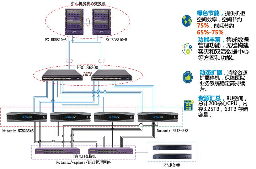 建设内容:云平台采购8节点超融合设备组成群集,2台高速度万兆以太网交换机提供独立的分布式存储和应用系统访问,云平台可提供具有高可用且兼容医院所有可运行在X86平台的虚拟化群集。2台USB服务器提供28个USB接口兼容加密狗、U盘等设备。