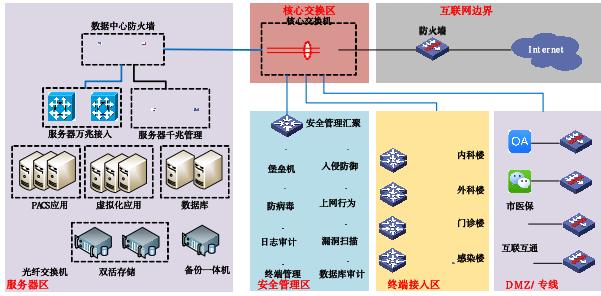 建设内容:根据医院信息系统功能进行网络分区,针对不同区域特点进行相应的网络保护。具体分为服务器区、终端接入区、安全管理区、专线接入区、核心交换区和互联网边界区。感染楼、内科楼及门诊13楼目前暂无汇聚物理安装条件,我司使用PON网络,在每个楼层设置一个或多个分光器,分光器与各科室ONU连接,各科室的终端设备(电脑、打印机等)接入OUN。